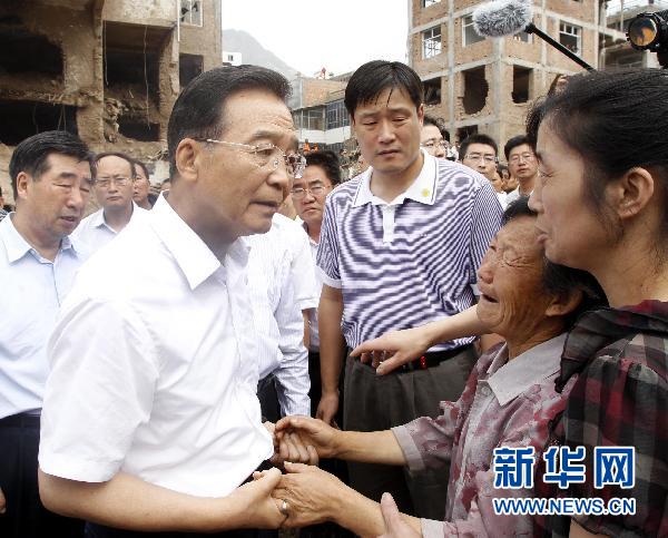 8月9日,中共中央政治局常委、國務(wù)院總理溫家寶繼續(xù)在甘肅舟曲縣特大山洪泥石流災(zāi)區(qū)察看災(zāi)情,指導(dǎo)抗洪搶險救災(zāi)工作。這是溫家寶在舟曲縣災(zāi)區(qū)撫慰失去親人的群眾。新華社記者 李學(xué)仁 攝