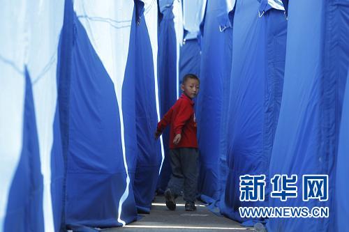 8月19日,在舟曲一個災民安置點,一名男孩在帳篷間玩耍。新華社記者 任正來 攝