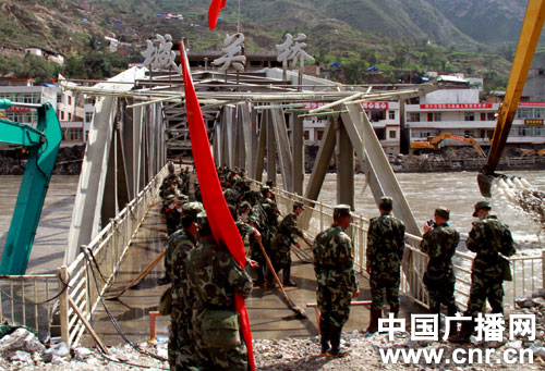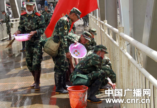 據(jù)武警甘肅總隊政治部副主任張進文介紹,城關橋是連接舟曲縣南北兩岸的重要通道,在泥石流災害發(fā)生后就一直被淹沒在江水中。隨著水面降低,橋面部分被淤泥掩蓋,為此,武警甘肅總隊甘南支隊的百余名官兵采取人工作業(yè),徒手將橋面的淤泥全部清除。