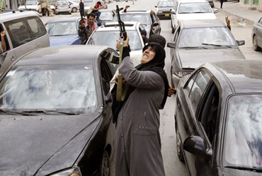 3月19日,利比亞第二大城市班加西,一名手持AK-47步槍的反對(duì)派婦女支持者在聽(tīng)說(shuō)擊退卡扎菲政府軍后鳴槍?xiě)c祝。反政府武裝發(fā)言人稱(chēng)周六他們已將卡扎菲部隊(duì)趕出了班加西城。
