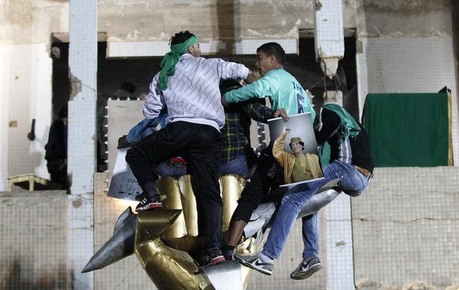 2011年3月19日,利比亞首都的黎波里,總統(tǒng)卡扎菲的支持者在卡扎菲官邸組成人肉盾牌防止多國聯(lián)軍轟炸。