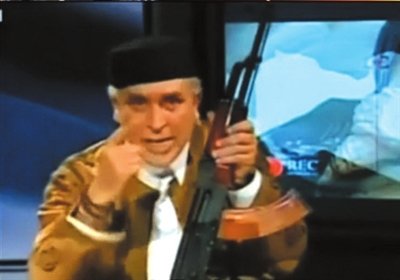 23日,利比亞電視臺一個頻道的新聞播音員在接通觀眾來電,談?wù)摾葋喰蝿輹r,突然舉起放在旁邊的AK-47步槍,誓言保衛(wèi)祖國、支持卡扎菲。他說:“敬愛的領(lǐng)袖,我愿為您奉獻,最后一口氣,最后一顆子彈,最后一滴血,最后一個孩子。