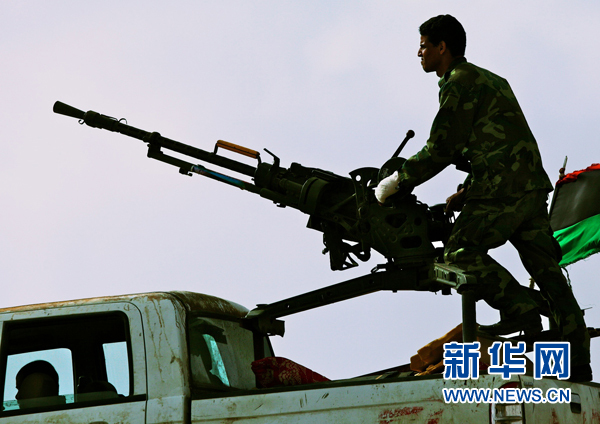 4月6日,在利比亞東部城市布雷加前線,一名反政府軍士兵坐在載有重型機(jī)關(guān)槍的卡車上。在北約空軍的空襲配合下,反政府軍當(dāng)天向布雷加發(fā)起進(jìn)攻,但尚不確定是否已攻占布雷加城。新華社記者才揚攝