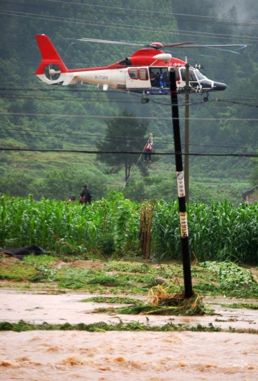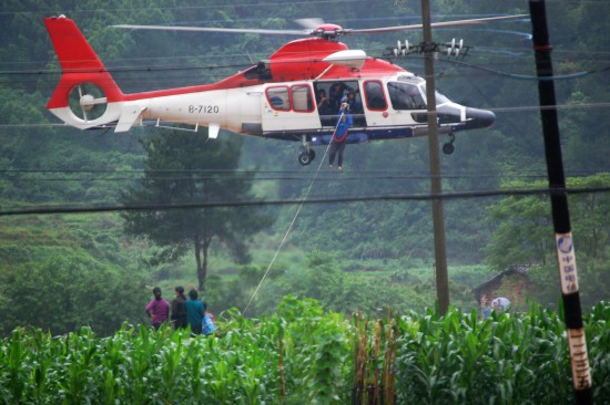 6月16日,救援直升機(jī)在營救被洪水圍困的群眾。