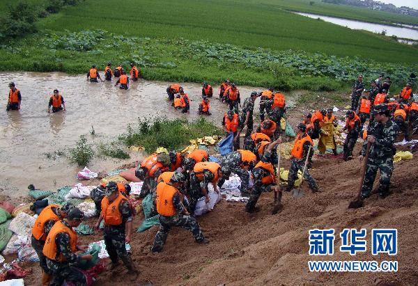6月21日,武警官兵在裝運(yùn)沙袋,封堵江西撫河孝橋段中洲堤決口。6月20日,連日的強(qiáng)降雨導(dǎo)致江西撫河孝橋段中洲堤出現(xiàn)一處決口,下游兩個(gè)鄉(xiāng)鎮(zhèn)10萬居民受到威脅。接到險(xiǎn)情后,武警江西省總隊(duì)立刻派出官兵趕往現(xiàn)場(chǎng)搶險(xiǎn)。新華社發(fā)(李典勝 攝)