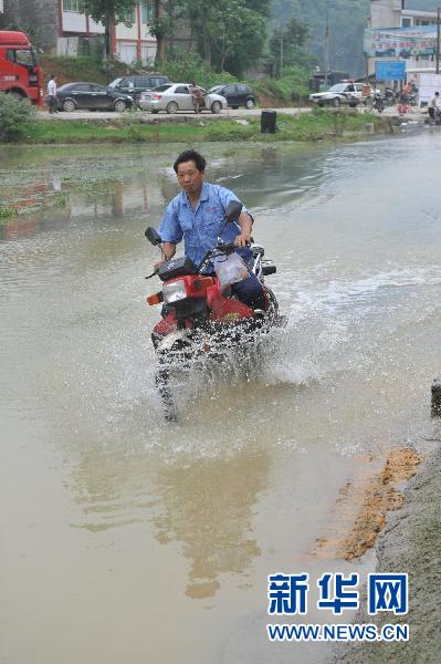6月21日,在貴州省遵義市正安縣樂儉鄉(xiāng),一村民駕車從積滿水的公路上經(jīng)過。 新華社記者歐東衢攝