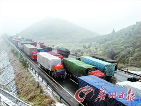 昨日,因?yàn)榇箪F和路面結(jié)冰引發(fā)貨車拋錨,京珠北一度排起10多公里長車龍。 記者卜瑜攝