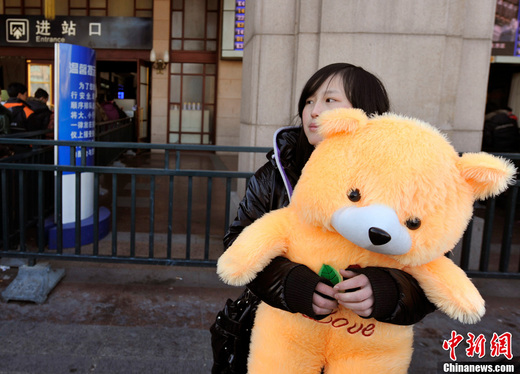 小姚在北京的一家家政公司工作,過年該回家了,她的好朋友知道她喜歡毛絨玩具,特地送給她一只大熊作為春節(jié)的禮物。小姚說:“我在火車上,有它陪著就不孤單了!敝行戮W(wǎng)記者 楊磊/攝 陳靜/文