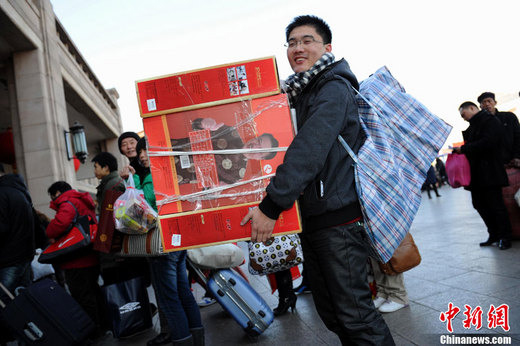 1月28日,準(zhǔn)備返鄉(xiāng)過年的旅客帶著大包小包步入北京站。 中新社記者 鄒憲 攝