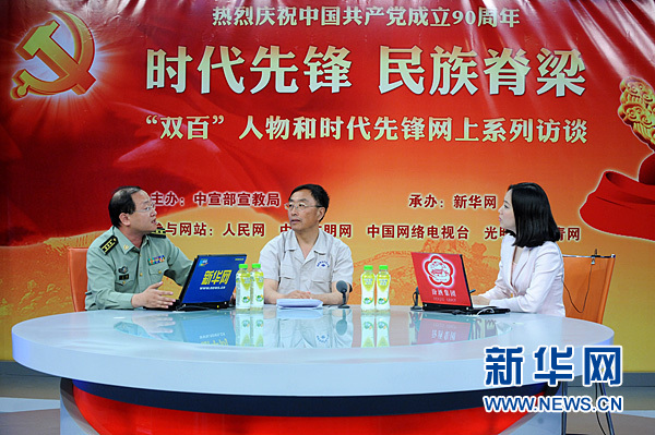 2011年5月17日,由中宣部宣教局主辦,新華網(wǎng)承辦,人民網(wǎng)、中國(guó)文明網(wǎng)、中國(guó)網(wǎng)絡(luò)電視臺(tái)、光明網(wǎng)、中青網(wǎng)共同參與的“時(shí)代先鋒 民族脊梁”——“雙百”人物和時(shí)代先鋒網(wǎng)上系列訪談在新華網(wǎng)訪談室進(jìn)行!半p百”人物,解放軍總裝備部計(jì)劃部參謀、王若飛之孫王強(qiáng),全國(guó)優(yōu)秀共產(chǎn)黨員、鞍鋼礦業(yè)公司齊大山鐵礦采場(chǎng)公路管理員郭明義與網(wǎng)友在線交流。圖為嘉賓與主持人在交談。新華網(wǎng) 陳競(jìng)超 攝