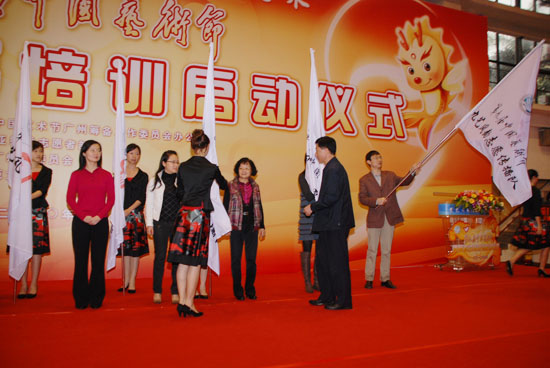 4月15日,由“九藝節(jié)”廣州籌委辦、第16屆亞運會組委會志愿者部、共青團廣州市委主辦的“賞藝術(shù)風(fēng)韻,展志愿風(fēng)采”——第九屆中國藝術(shù)節(jié)志愿者招募培訓(xùn)啟動儀式在華南師范大學(xué)隆重舉行!熬潘嚬(jié)”廣州籌委辦主任、廣州市文化廣電新聞出版局局長陸志強,“九藝節(jié)”廣州籌委辦常務(wù)副主任、廣州市文化廣電新聞出版局副局長張潤華,團市委副書記、亞組委志愿者部副部長魏國華等領(lǐng)導(dǎo)出席了啟動儀式。啟動儀式由團市委學(xué)校少年部部長葉興仁主持,團市委副書記魏國華致辭,陸志強局長作動員講話。