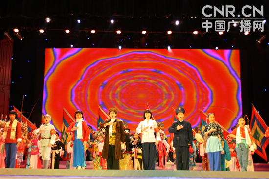 圖為“群星獎”頒獎晚會上,廣東省深圳市寶安區(qū)少兒京劇團的小演員演唱戲曲歌舞《咱們都是中國娃》。(中廣網(wǎng)記者時晨 攝)