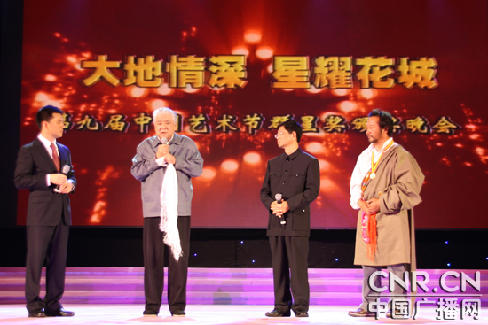 圖為“群星獎”頒獎晚會上,著名表演藝術(shù)家李默然老師對“群文獎”獲獎?wù)哌M行評價。(中廣網(wǎng)記者時晨 攝)