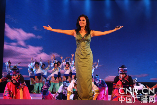 圖為“群星獎”頒獎晚會上,歌唱演員韋唯演唱歌曲《笑進萬家》。(中廣網(wǎng)記者時晨 攝)