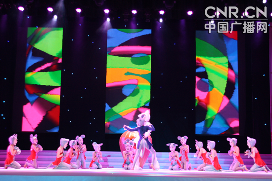 圖為“群星獎”頒獎晚會上,廣東省茂名市梅舞嘉音小明星訓(xùn)練營演出的少兒舞蹈《貓鼠之夜》。(中廣網(wǎng)記者時晨 攝)