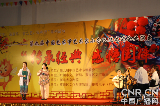 中廣網(wǎng)廣州5月23日消息(記者時晨)昨天(22日)下午,一場名為“傳承經(jīng)典,感悟國粹”的演出在捷普電子(廣州)有限公司精彩上演。來自河北省京劇院的藝術(shù)家們?yōu)閺V大工人們奉上了《霸王別姬》、《貴妃醉酒》、《紅燈記》等經(jīng)典京劇選段,現(xiàn)場不時爆發(fā)出雷鳴般的掌聲。