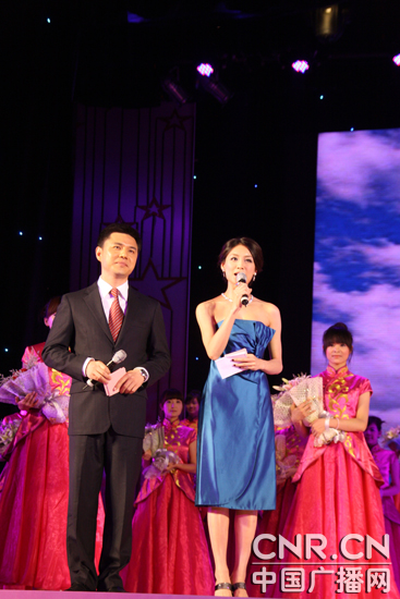 圖為“群星獎”頒獎晚會上的主持人趙普(左)(中央電視臺)和趙榮(右)(廣州電視臺)。(中廣網(wǎng)記者時(shí)晨 攝)