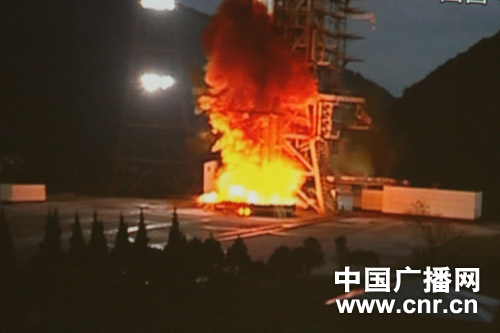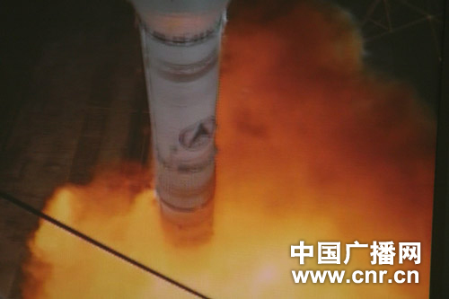 在北京飛控中心指揮大廳里傳來的西昌衛(wèi)星發(fā)射中心現(xiàn)場照片 圖為嫦娥2號發(fā)射過程 中廣網記者李志勇 攝
