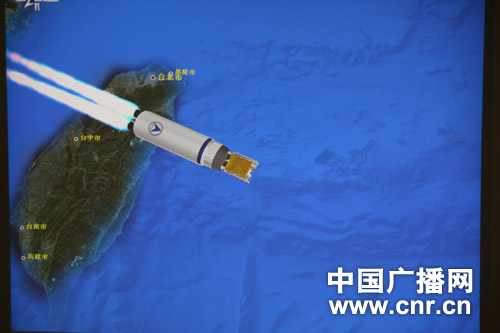 在北京飛控中心指揮大廳里傳來的西昌衛(wèi)星發(fā)射中心現(xiàn)場(chǎng)照片,圖為嫦娥2號(hào)3D模擬飛行
