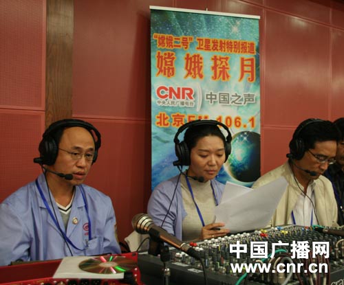 中國之聲正在直播嫦娥二號第三次近月制動,圖為特邀嘉賓北京航天飛行控制中心總工程師助理唐歌(左)實做客中國之聲。