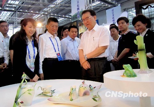 5月16日,中共中央政治局常委李長春來到第六屆中國(深圳)國際文化產(chǎn)業(yè)博覽交易會考察,望不斷總結(jié)經(jīng)驗,把中國(深圳)文博會辦成中國文化產(chǎn)業(yè)走向世界的國際知名品牌。圖為李長春在文博會參觀臺灣文化創(chuàng)意精品法藍瓷展。 中新社發(fā) 陳文 攝