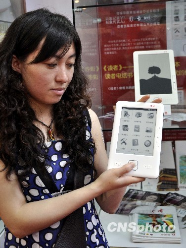 5月14日,深圳第六屆文博會上,第二代電紙書揭開神秘面紗。這款DZ60A的電紙書,不僅采用視野廣闊的6寸大屏幕,而且應(yīng)用了16灰階電子墨水技術(shù),無論從圖片或文字,黑白灰的過度更細膩,更接近與紙質(zhì)的高清顯示。該《讀者》電紙書,其容幾乎囊括了《讀者》所有的精彩內(nèi)容,更能隨時下載新一期的內(nèi)容。 中新社發(fā) 趙石羊 攝