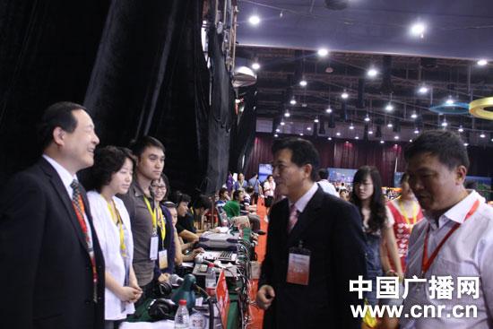 杜嗣琨(左一)與開幕式直播總指揮親切交談。中廣網(wǎng)記者 王曉宇 攝