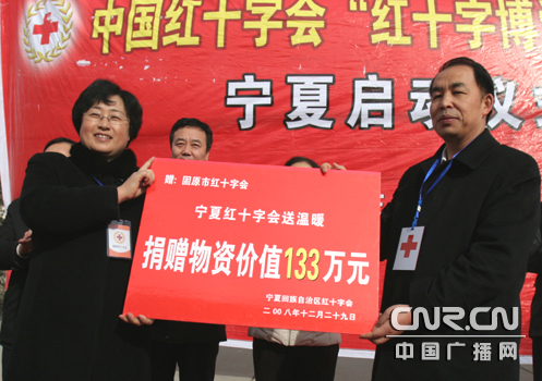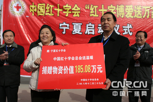 中廣網(wǎng)銀川12月29日消息(記者郭長江)今天上午,中國紅十字會黨組書記、副會長江亦曼和寧夏回族自治區(qū)副主席姚愛興和寧夏自治區(qū)紅十字會的負責志帶著230多萬元的物資來到寧夏回族自治區(qū)固原市慰問救助遭受到汶川地震和當?shù)氐卣鹩绊懙?2000多戶受災群眾。當日,中國紅十字會“紅十字博愛送萬家”活動在四川、陜西、寧夏三省區(qū)同時啟動。