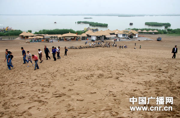 在沙沙聲中,登上沙湖分界線——二三十米高的沙漠脊梁。向兩邊張望,一邊是沙漠一邊是湖水。沙與水本是矛盾的兩端,相互充滿著張力。在這里沙與水卻相互映照、相互依偎,沙為水注入了硬度,水為沙增添了柔美,分不清誰是紅花、綠葉。造物主似乎也想做個媒人,帶了個南方湖泊來到北方,又捧了些精細的沙灑在湖的周圍!氨狈接矟h”與“南方婉約女子”就這樣牽手。