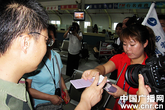 工作人員分發(fā)赴臺(tái)“通行證”及船票