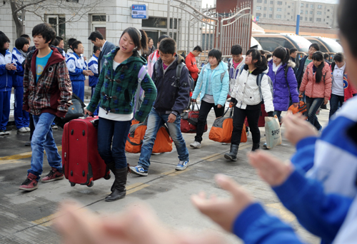 當(dāng)日,在甘肅省交通廳的統(tǒng)一組織下,舟曲一中1200多名學(xué)生在家鄉(xiāng)度過寒假后乘坐巴士返回蘭州,開始新學(xué)期的學(xué)習(xí)生活。新華社記者 聶建江 攝