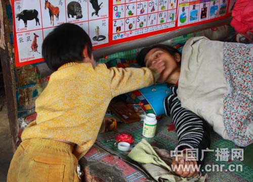 四歲的小孫悅給癱瘓在床的媽媽喂藥