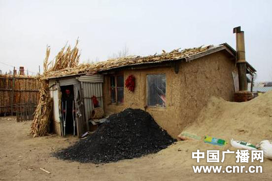 這里就是小孫悅的家,這是一間用木板和泥巴搭建成的房子,也就十幾平方米大小。冬天了,窗戶上沒有玻璃,只是蒙上了一層塑料,房頂上也只是鋪上一層玉米稈來防雨防寒。門口堆放的一大堆煤黑,是前些天好心人給送來的,這個應該夠他們燒一個冬天了。