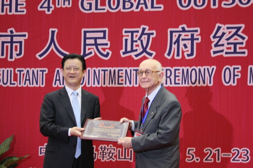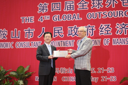 2011年5月21日至23日,亞太總裁協(xié)會(APCEO)與中國商務(wù)部國際貿(mào)易經(jīng)濟(jì)合作研究院、安徽省商務(wù)廳、安徽省馬鞍山市人民政府共同主辦的第四屆(2011)全球外包大會在中國江南山水詩都——安徽省馬鞍山市隆重舉行。馬鞍山市人民政府經(jīng)濟(jì)顧問聘任儀式在第四屆全球外包大會在大會期間舉辦。
