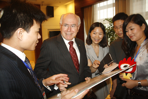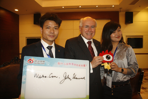 澳大利亞前總理霍華德(中)給新浪微博題詞后欣然與亞太總裁協(xié)會中國常務(wù)副秘書長闕志華(左)等合影留念