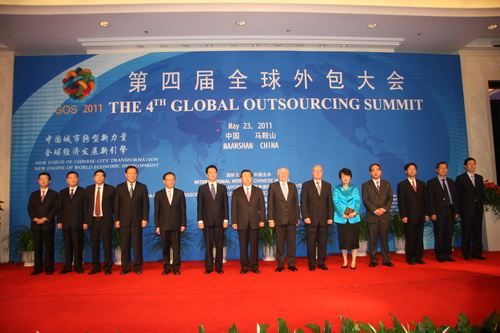 第四屆全球外包大會(huì)開(kāi)幕式主席臺(tái)嘉賓見(jiàn)證合作文本交換儀式并合影