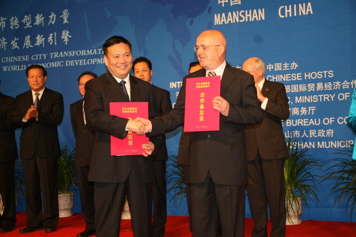 安徽省商務(wù)廳廳長方西屏(左)和亞太總裁協(xié)會(huì)全球副會(huì)長加諾上將(右)交換亞太總裁協(xié)會(huì)、安徽省商務(wù)廳友好合作備忘錄