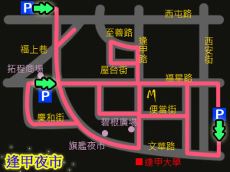 首先,要了解逢甲夜市的路線。逢甲夜市有幾條主要道路,福星路與逢甲路交叉成十字路口,旁邊有個(gè)麥當(dāng)勞,是許多人相約等待、指示路線的標(biāo)示物?拷致房诘牡胤,有一條屋臺(tái)街,這個(gè)區(qū)塊以服飾、飾品、精品為主;逢甲路20巷則是大家口中的“便當(dāng)街”,全長(zhǎng)約三百公尺,沿路兩旁幾乎都是美食小吃、飲料冰品。