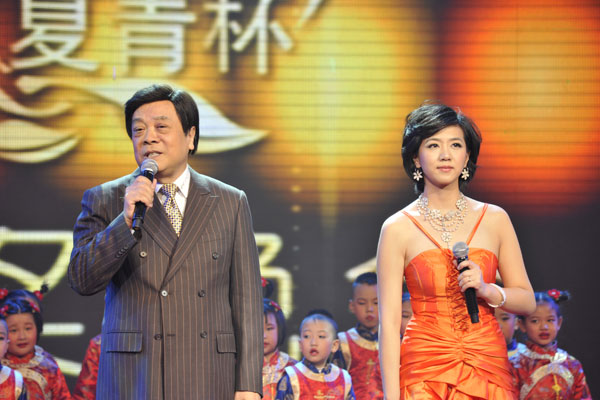 首屆“夏青杯”朗誦大賽頒獎晚會主持人趙忠祥(左)、劉玉蕾