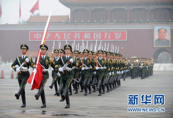 7月1日,國旗護(hù)衛(wèi)隊(duì)?wèi)?zhàn)士護(hù)送國旗走向升旗臺(tái)。當(dāng)日,來自全國各地的數(shù)萬名群眾匯聚北京天安門廣場(chǎng),觀看隆重的升旗儀式,紀(jì)念中國共產(chǎn)黨成立90周年。 新華社記者 羅曉光 攝