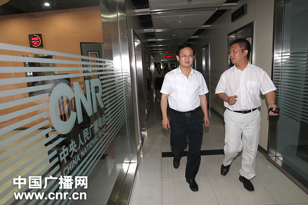 中央人民廣播電臺副臺長王曉暉陪同鐵道部新聞發(fā)言人王勇平參觀直播區(qū)