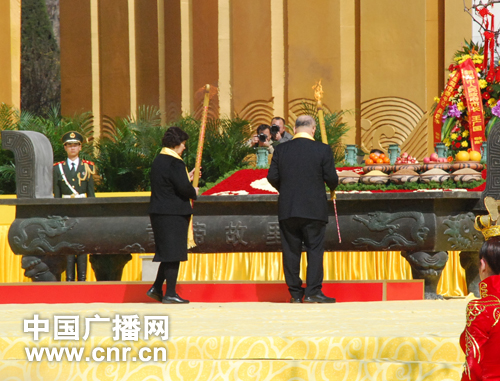 受邀參加壬辰年黃帝故里拜祖大典的中國國民黨榮譽主席吳伯雄及其夫人敬獻(xiàn)了頭香。