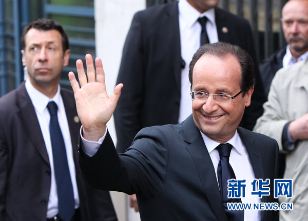 5月6日,法國(guó)社會(huì)黨候選人弗朗索瓦·奧朗德(前)抵達(dá)法國(guó)南部城市圖勒一家投票站。新華社記者高靜攝