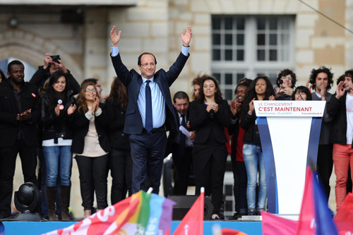 4月15日,法國社會黨總統(tǒng)候選人弗朗索瓦·奧朗德在巴黎舉行的大規(guī)模競選集會上向支持者致意。(圖片
