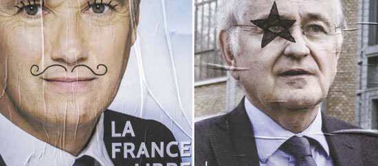近日,法國大選正如火如荼地進行,一些候選人的大幅宣傳畫隨處可見。很不幸的是,薩科齊等人的宣傳畫不知被誰涂鴉。近日,法國大選正如火如荼地進行,一些候選人的大幅宣傳畫隨處可見。