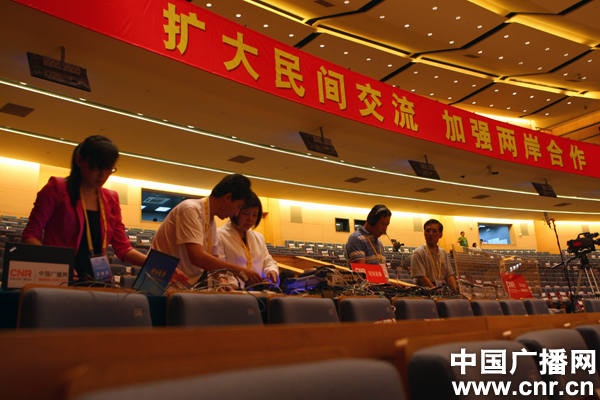 第四屆海峽論壇,中央人民廣播電臺工作人員在調(diào)試設備(中廣網(wǎng)記者 李雪南攝)