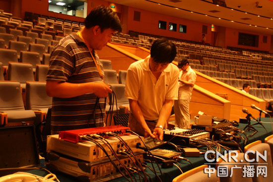 第二屆海峽論壇直播現(xiàn)場,工作人員正在調(diào)試設(shè)備