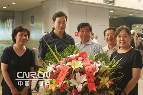 7月5日,中央臺(tái)慶祝香港回歸十周年前方報(bào)道組凱旋歸來(lái)。圖為中央臺(tái)副總編輯王宴青(左三)、總工程師錢岳林(左二)等在首都機(jī)場(chǎng)合影