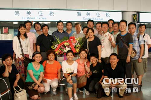 7月5日,中央臺(tái)慶祝香港回歸十周年前方報(bào)道組凱旋歸來(lái)。圖為前方報(bào)道組成員和后方配合人員在首都機(jī)場(chǎng)的合影