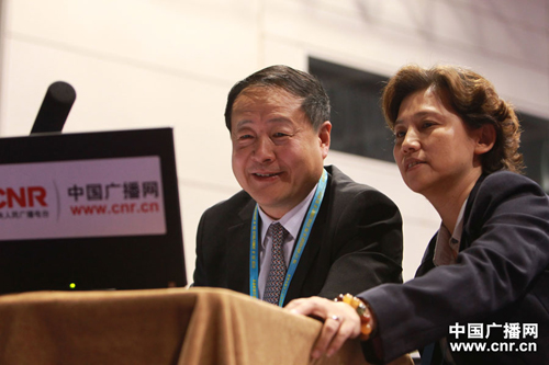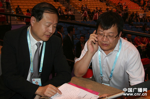 中央臺(tái)副總編輯杜嗣琨(圖左)、中央臺(tái)總編室綜合宣傳管理處處長(zhǎng)候永生(圖右)核對(duì)直播稿(中廣網(wǎng)記者何偉奇 杜煒 攝)